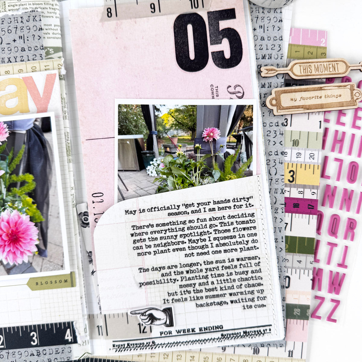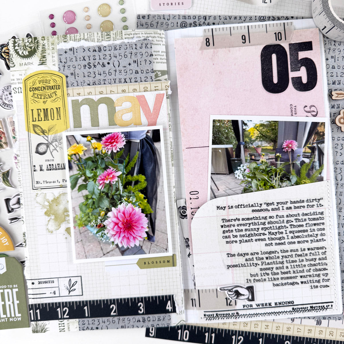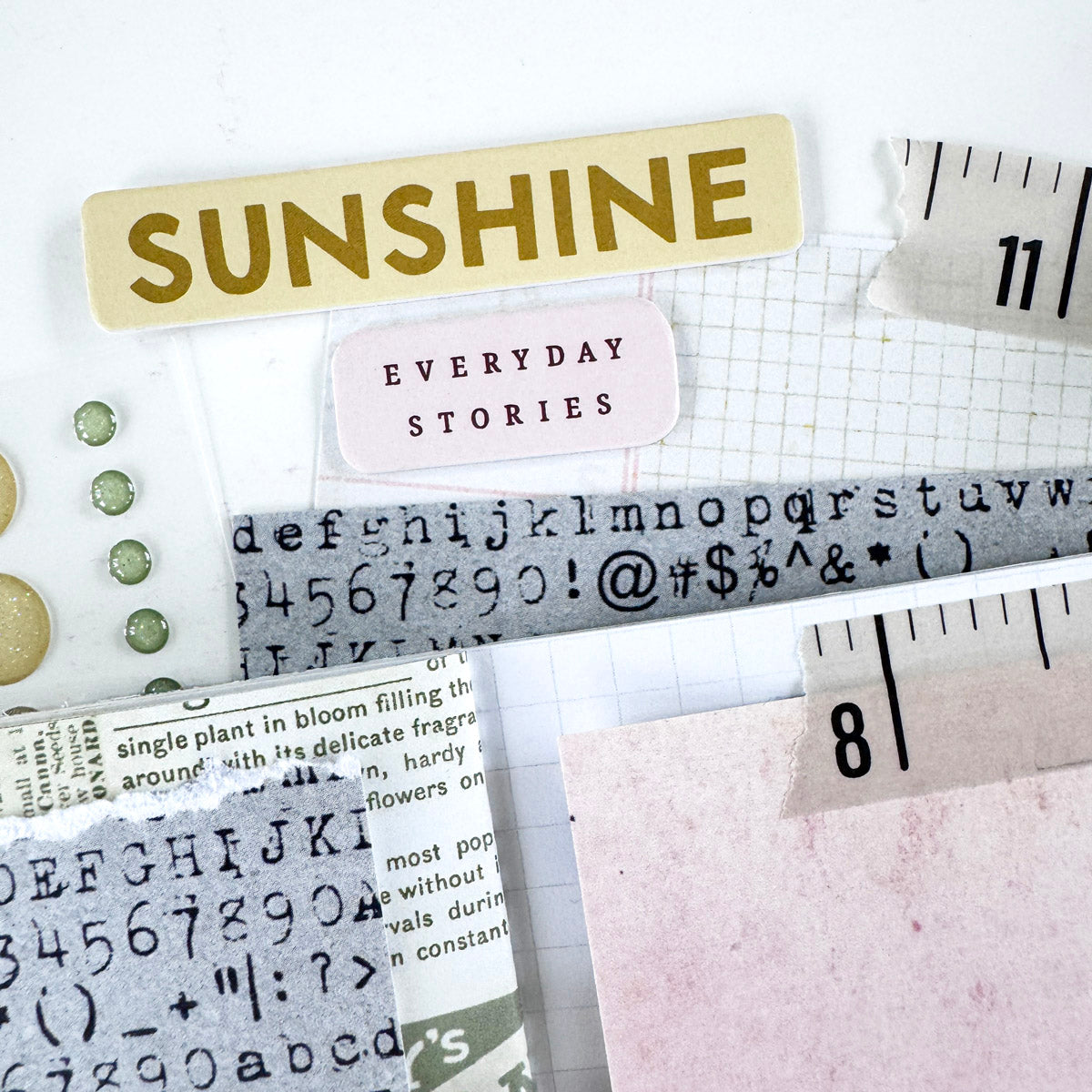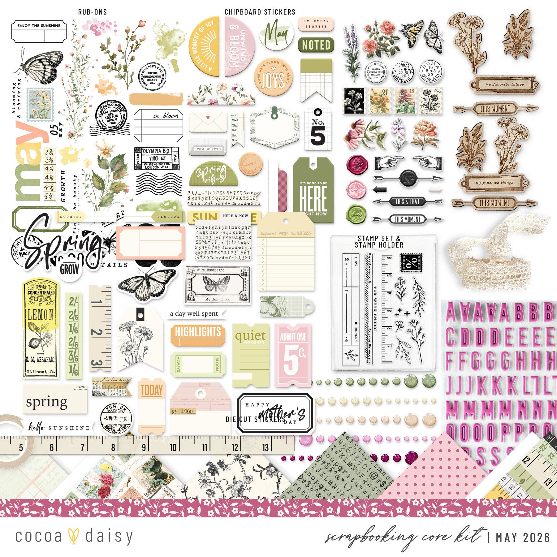 - Plus an assortment of other items, including (but not limited to) stickers, alphabets, chipboard, washi tape, stamping ink, rub on transfers, glitter dots and various other embellishments; items will change each month.