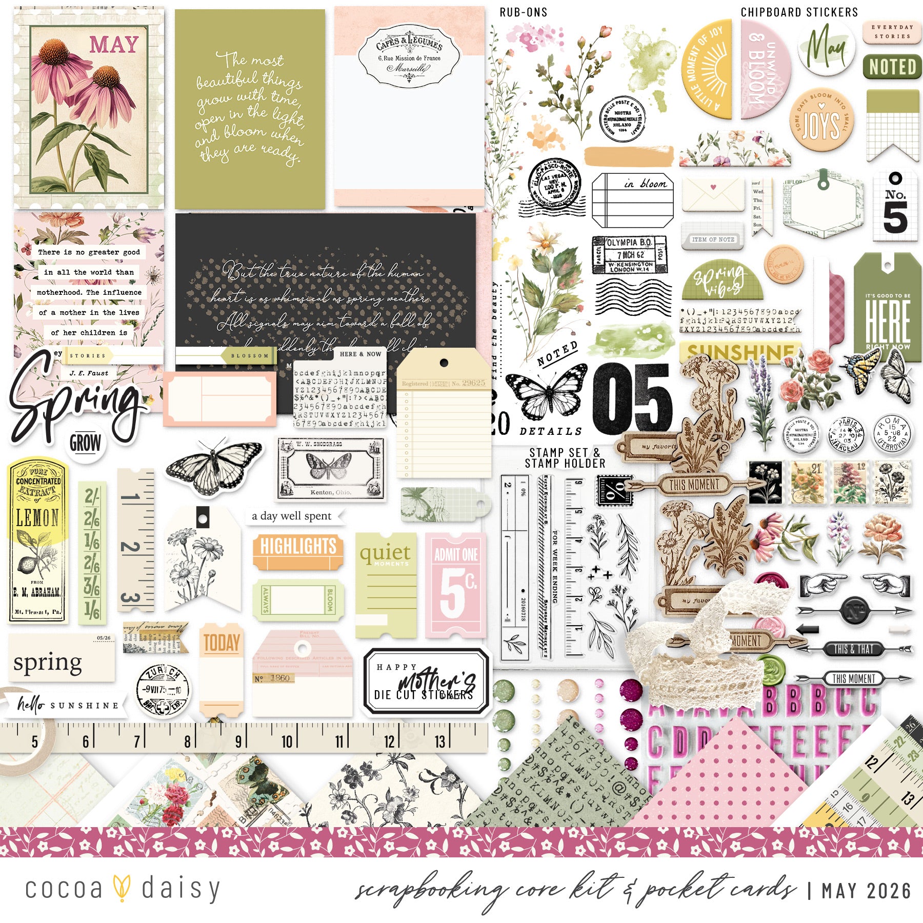 - Plus an assortment of other items, including (but not limited to) stickers, alphabets, chipboard, washi tape, stamping ink, rub on transfers, glitter dots and various other embellishments; items will change each month.